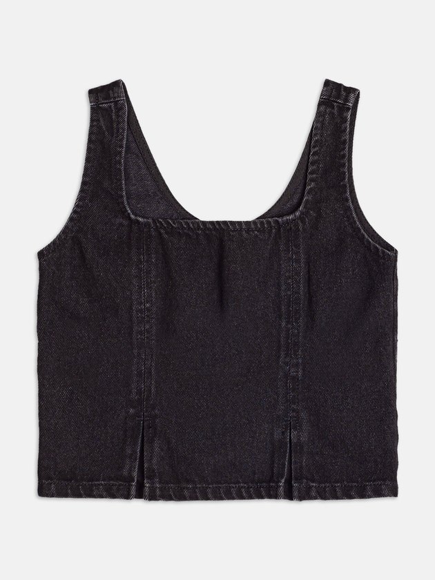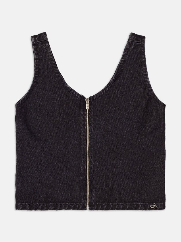 O jeans escuro se transforma em um top moderno e estruturado, com estética minimalista e toque urbano. Um curinga que se adapta a diversas propostas de estilo.