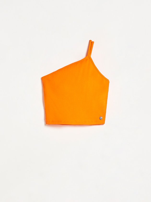 Top laranja Authoria desenvolvido em ribana, com alças duplas e plaquinha de metal frontal. Peça básica, ideal para compor looks práticos para o dia a dia. Composição: 98% algodão e 2% elastano. Ref.: T8950