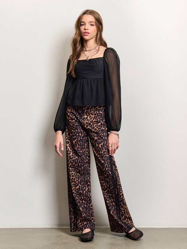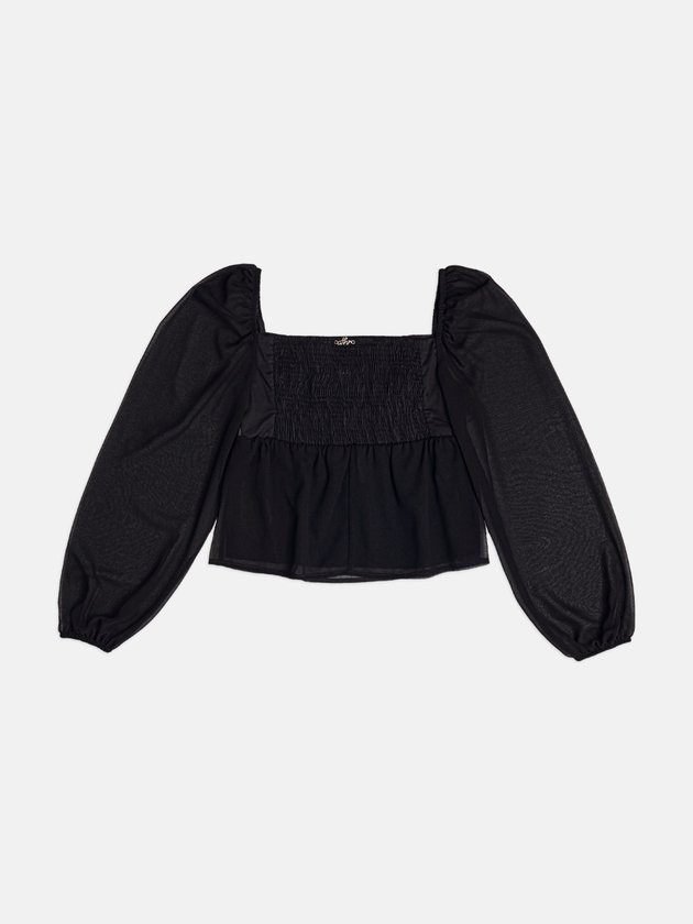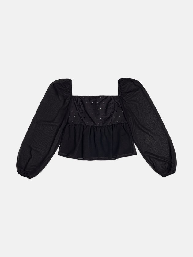 Blusa preta perfeita para quem ama um look delicado com toque glam. A região do busto recebe aplicações de pedrarias brilhantes que criam pontos de luz sutis e elegantes. As mangas longas em tecido leve e levemente transparente trazem movimento e deixam o visual mais romântico. A barra soltinha forma um peplum suave, que ajuda a equilibrar a silhueta e combina bem com peças mais sequinhas na parte de baixo, como saia lápis, jeans reto ou calça de alfaiataria. Ref.: R5751