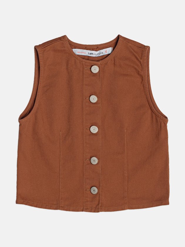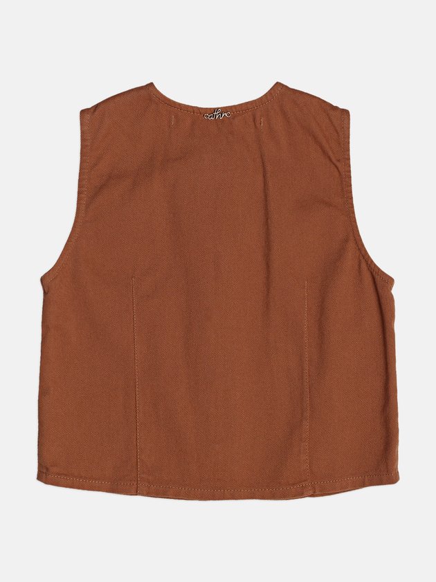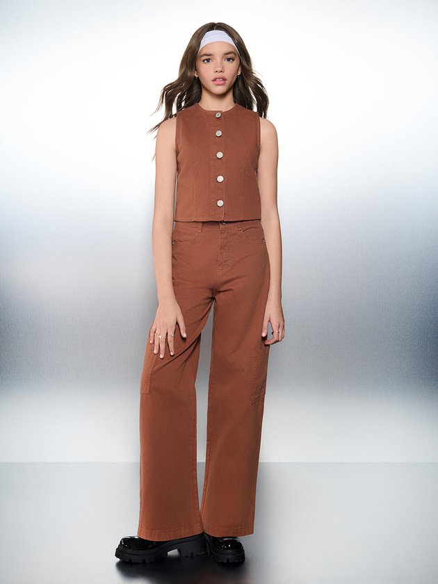 Top em sarja caramelo com visual moderno e estruturado. A modelagem ajustada realça o corpo e os botões frontais funcionam como detalhe decorativo, trazendo aquele toque utilitário chic. O tecido é firme, leve e confortável, perfeito para combinações com saias, jeans ou peças de alfaiataria. Um top versátil e estiloso que vira protagonista fácil em qualquer look. Ref.: R5705