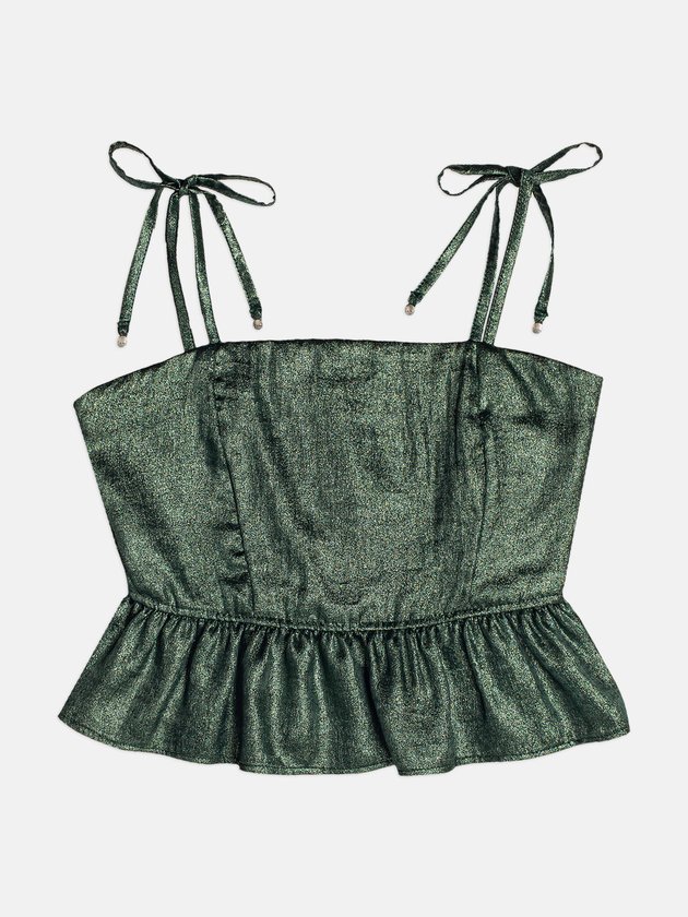 O top verde metalizado chega com aquele brilho moderno que transforma qualquer look sem esforço. O tecido tem um glow sofisticado, nada exagerado, dando um efeito noite cool. As alças finas com amarração permitem ajuste perfeito e criam um charme delicado. A barra com babadinho traz movimento e deixa o visual mais leve. Um top pensado para quem curte presença, conforto e informação de moda na medida, ideal para usar com saias, calças amplas ou até sobreposição. Ref.: R5755