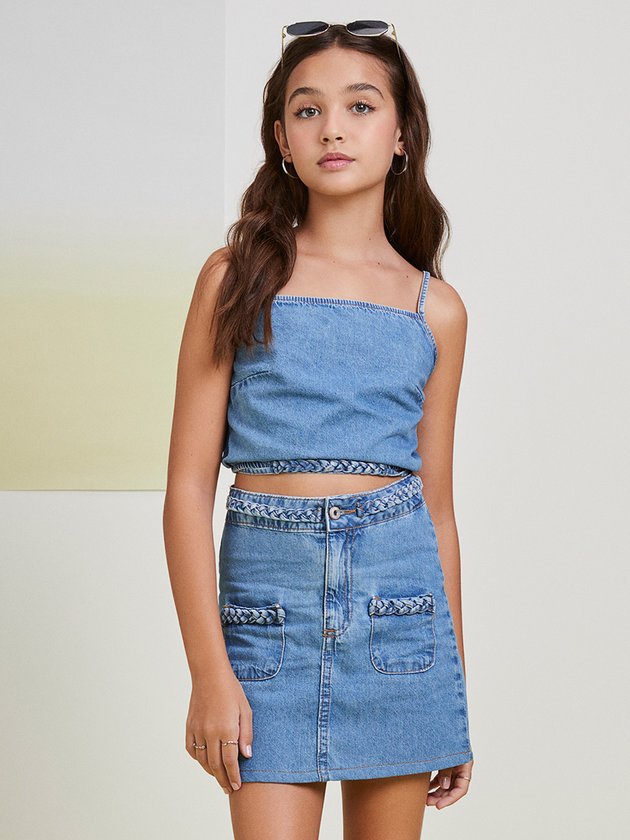 O Cropped jeans I Am traz amarração na cintura e elástico nas costas para dar um ajuste melhor no corpo das garotas. Acompanhando a tendência da moda, é versátil e estiloso, perfeito para compor looks modernos. Composição: 100% algodão. Ref.: R3946