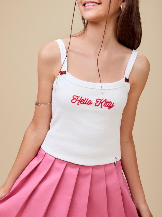 Feminino e delicado, esse top da Hello Kitty mistura a estética fofa da personagem com um visual fashion. Ideal para compor com peças de cintura alta e looks afetivos.