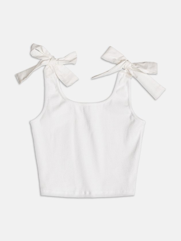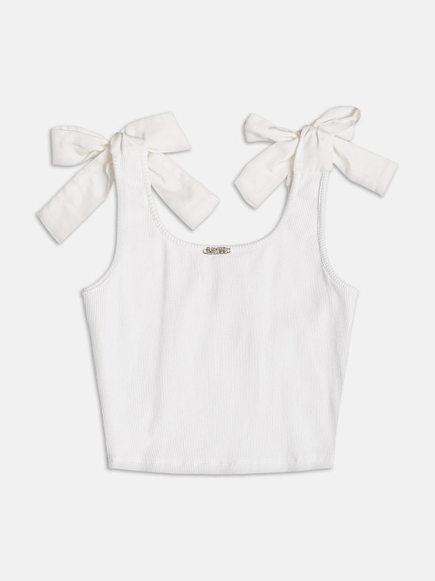 Os laços aplicados trazem um ar romântico para esse top de ribana off white. Com toque delicado e modelagem ajustada, ele é perfeito para produções que unem conforto e feminilidade.
