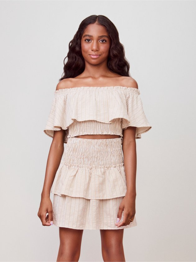 O ombro à mostra e o efeito anarrugado garantem um visual leve e feminino. Versátil e moderno, o top valoriza o colo e se encaixa perfeitamente em produções casuais e urbanas.