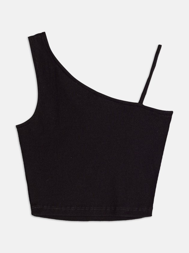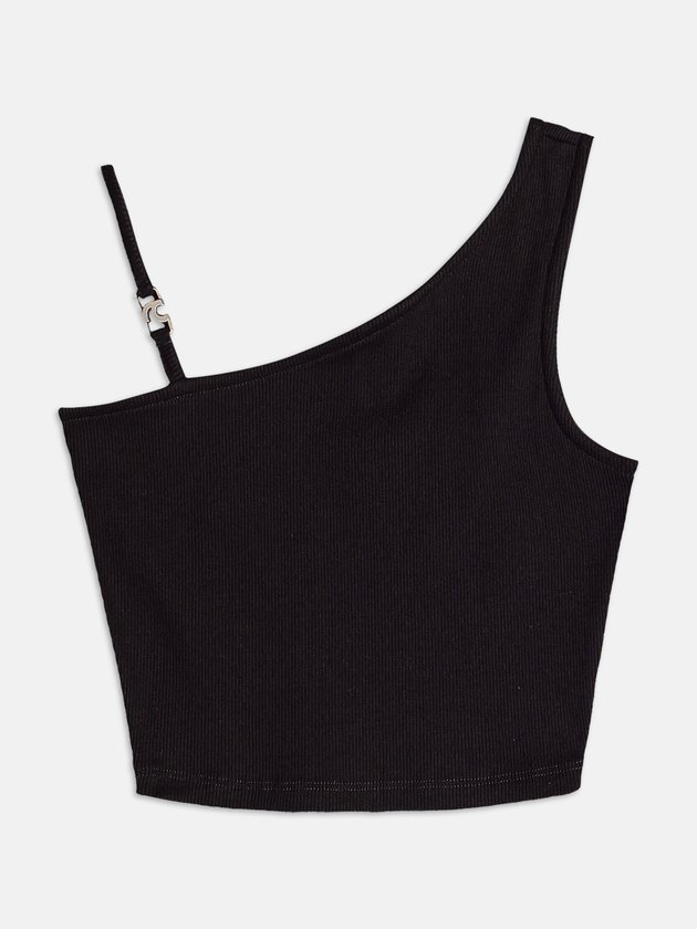 Simples, versátil e ajustado ao corpo, esse top preto de ribana com alça é uma base essencial para combinações urbanas ou produções em camadas.