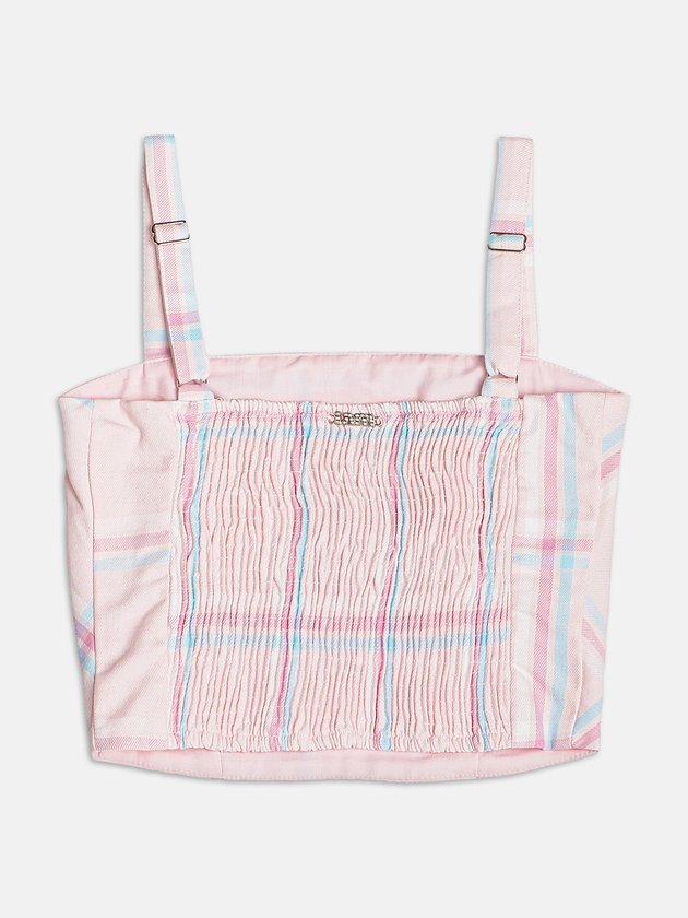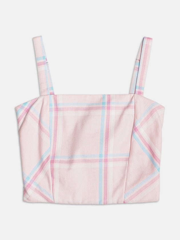 O quadriculado em rosa confere feminilidade com estilo retrô. Um top que equilibra o visual girlie com a estética urbana da coleção.