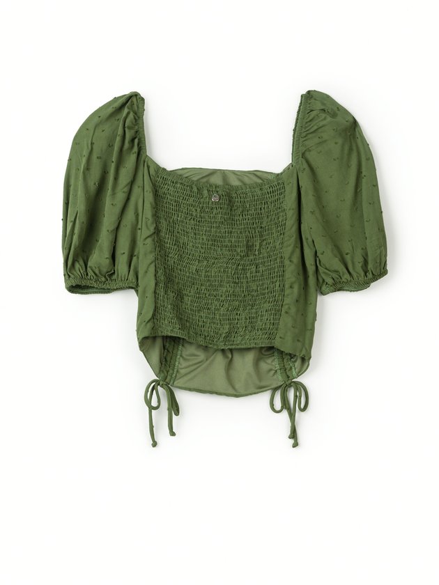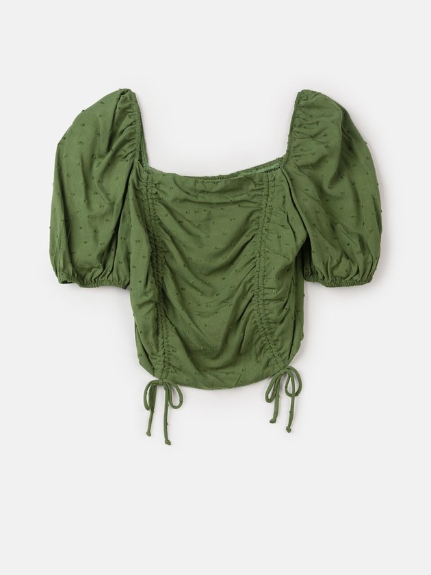 Elegante e feminino, este top verde com drapeado e manga curta é ideal para composições modernas e despojadas. O drapeado acrescenta um toque de textura e sofisticação, enquanto a cor vibrante garante um visual marcante. Perfeito para combinar com peças de cintura alta para um look fashion.