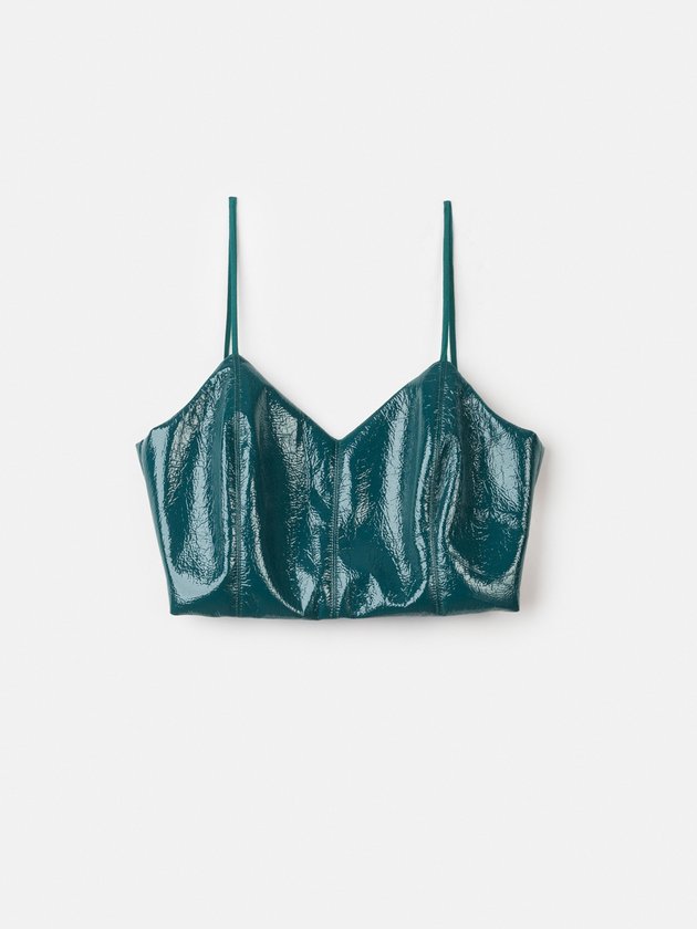 O cropped Authoria foi elaborado em tecido vinil na cor verde petróleo, deixando a peça ainda mais confortável e prática para as garotas traz costas com lastex. Também conta com alças para amarrar e plaquinha de metal dando autenticidade para o look. Composição: 100% poliéster. Ref.: T8870