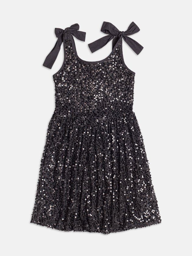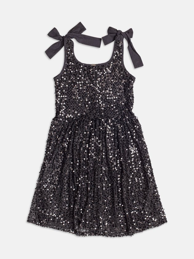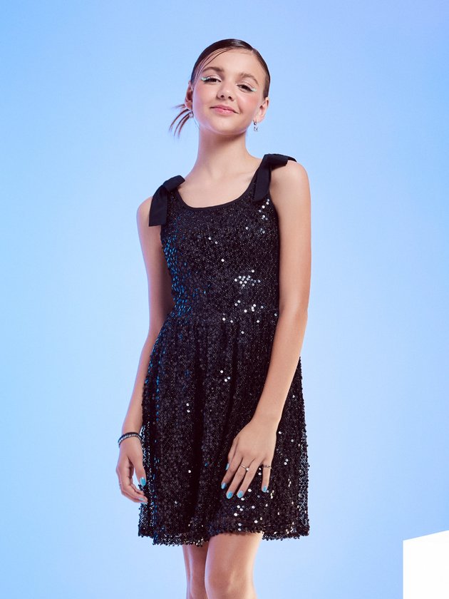 Combinando brilho e feminilidade, o vestido preto de paetê se destaca pelos laços aplicados, que acrescentam charme ao visual glam. Uma escolha perfeita para noites marcantes.