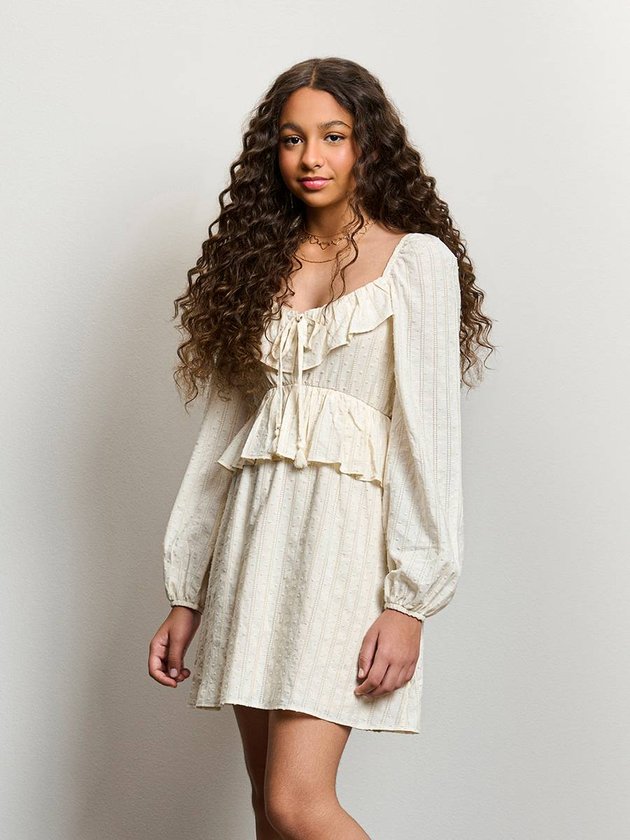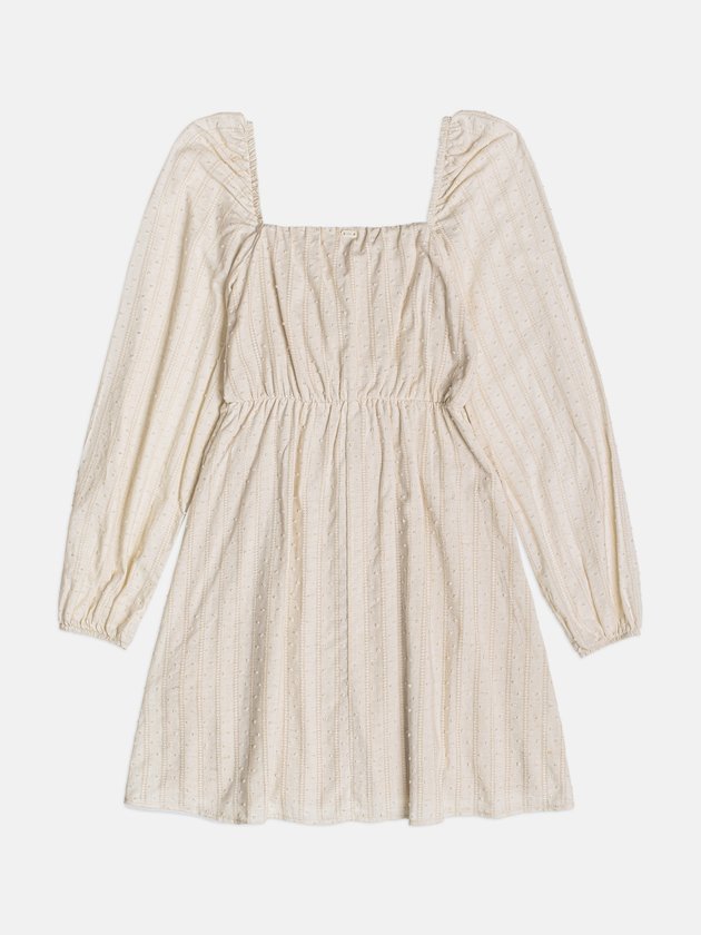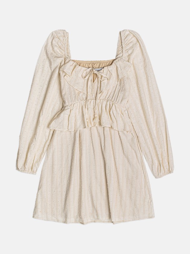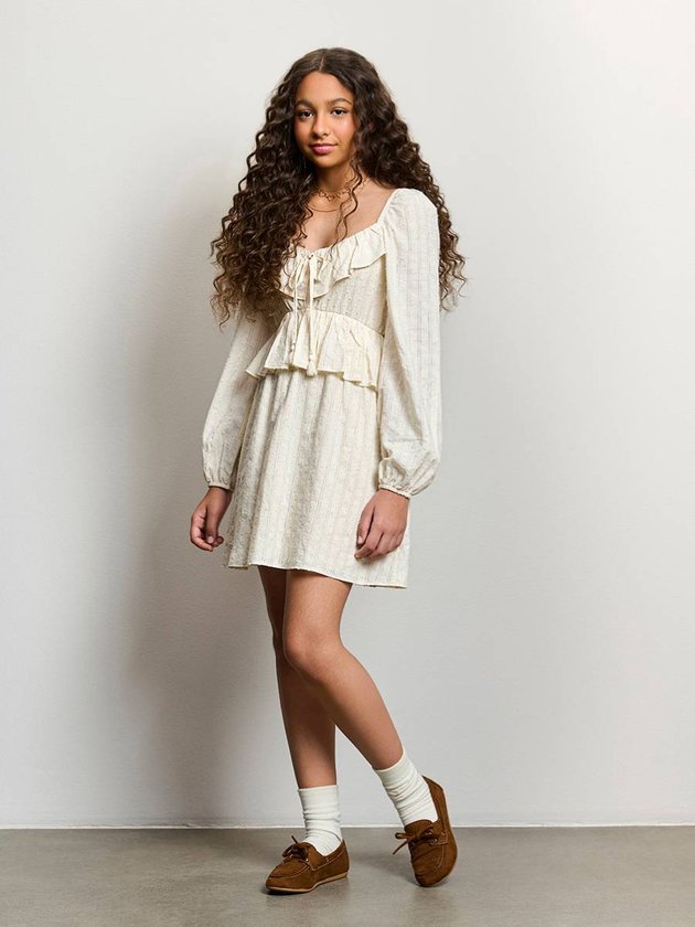 Esse vestido off-white traduz a essência romântica e delicada da coleção Backstage, com babados suaves e detalhes que tornam a peça única. O decote quadrado é emoldurado por um babado volumoso, trazendo movimento e embelezado por amarração frontal com ponteiras que acrescentam charme artesanal. As mangas longas têm volume sutil e punhos franzidos, criando uma silhueta feminina e fluida. O tecido texturizado com mini poás e listras verticais adiciona profundidade, leve brilho e sofisticação, reforçando o mood etéreo da peça. A modelagem solta e confortável torna o vestido ideal para o dia a dia, eventos leves ou produções especiais. Ele combina perfeitamente com botas, sandálias delicadas ou acessórios metalizados que iluminam o look. É uma peça que captura a poesia da coleção, unindo leveza, estilo e aquele toque fashion que só a Authoria sabe entregar. Ref.: R5466