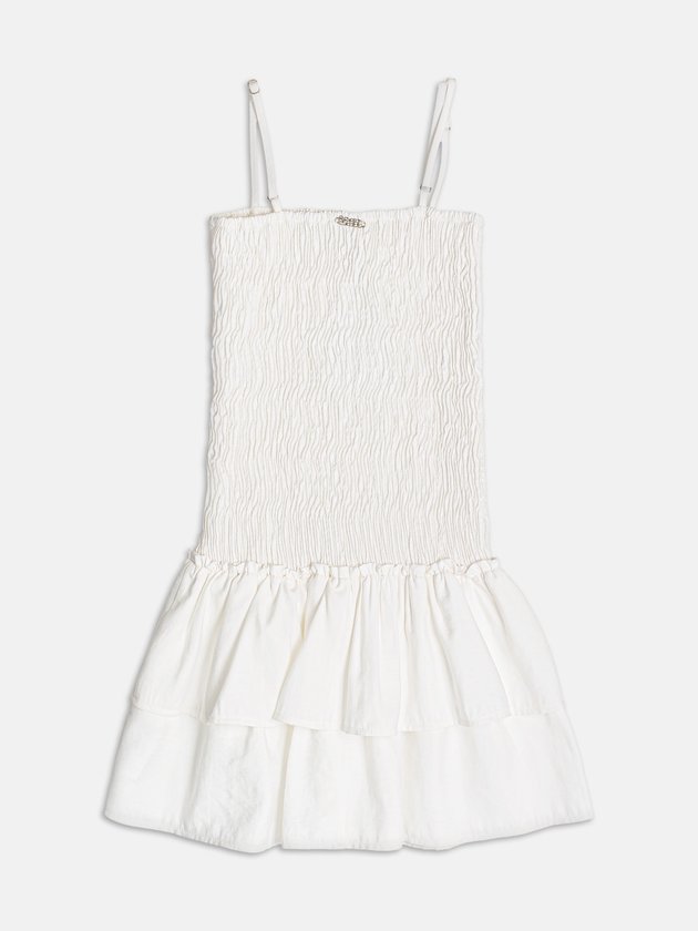A textura do lastex se une ao tom off white em um vestido que exala delicadeza. Com caimento fluido e cintura marcada, é a escolha ideal para momentos leves com um toque de feminilidade moderna.