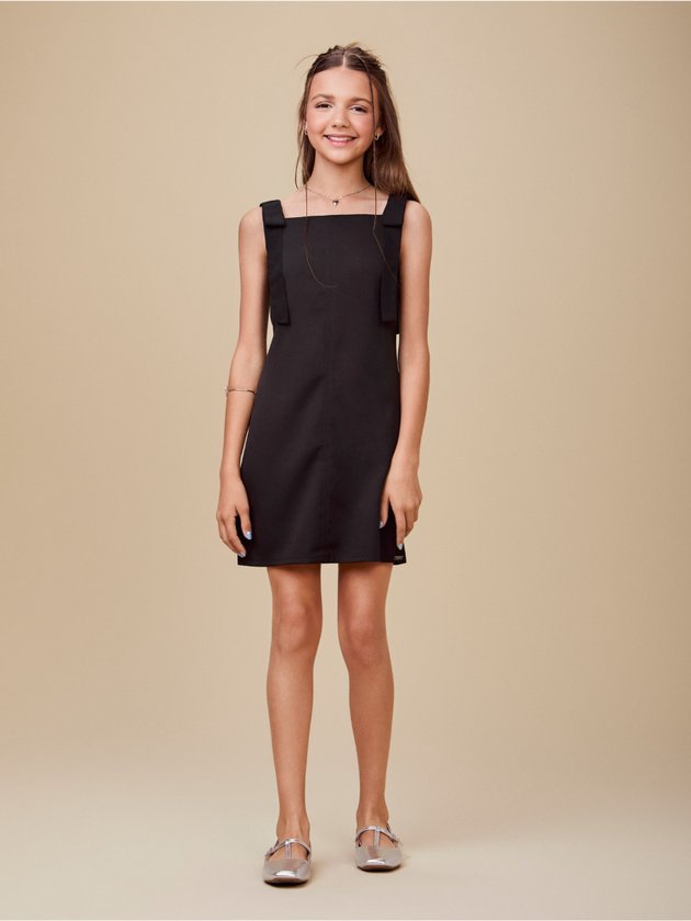 Com charme delicado e uma pitada fashion, o vestido preto ganha destaque pelos laços aplicados estrategicamente. O contraste entre a sobriedade da cor e a leveza dos detalhes cria um visual sofisticado com personalidade. Ideal para ocasiões especiais com um toque romântico.
